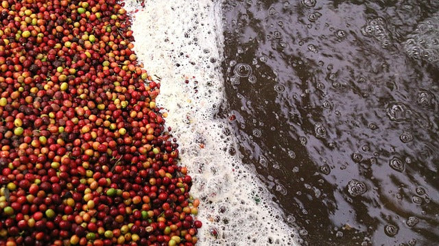 Unmittelbar nach der Ernte werden die Kaffeekirschen mit einem professionellen Wasch- und Siebsystem gereinigt, um Blätter, Zweige, Erde und andere Verunreinigungen zu entfernen.